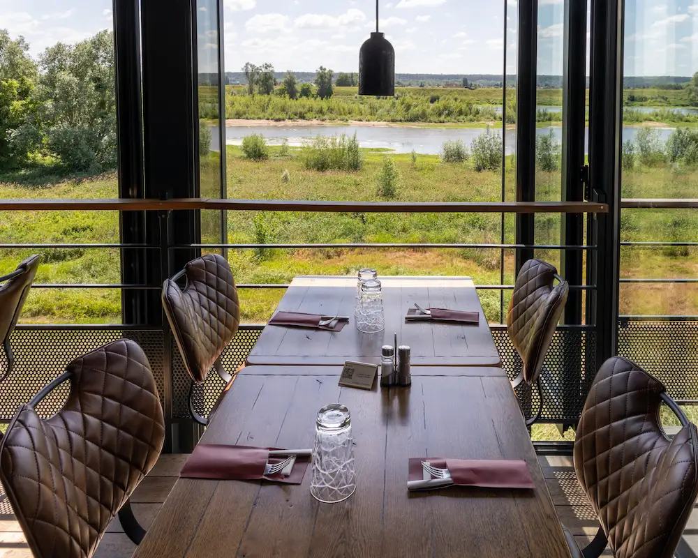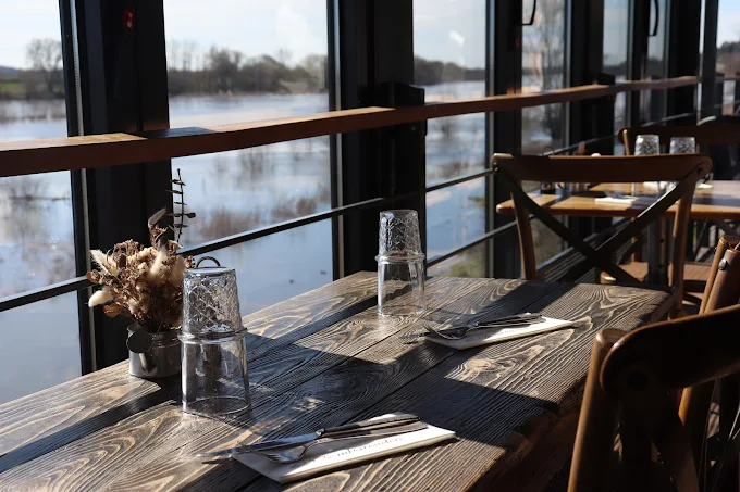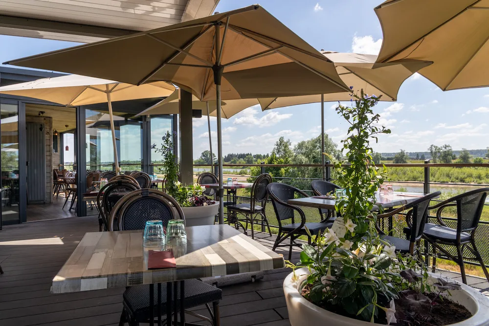 Les baies vitrées s’ouvrent aux premiers rayons. La Loire perd doucement en largeur, dévoilant des berges en devenir. Les cygnes glissent au fil de l’eau, la verdure reprend ses droits, et la terrasse retrouve ses habitudes. C’est le retour du café au soleil, et de la nature qui s’éveille.